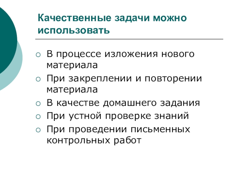 Качественные задачи можно использоватьВ процессе изложения нового материалаПри закреплении и повторении материалаВ качестве домашнего заданияПри устной проверке