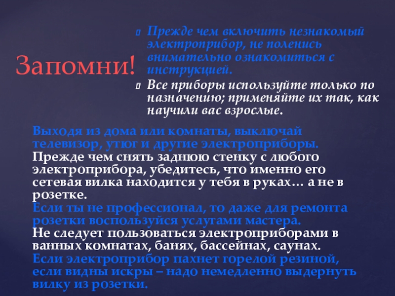 Если электроприбор пахнет горелой резиной, если видны искры – надо немедленно выдернуть вилку из розетки.