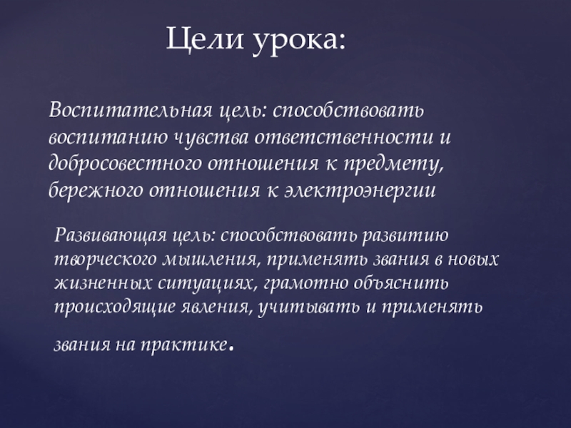 Воспитательная цель: способствовать воспитанию чувства ответственности и добросовестного отношения к предмету, бережного отношения к электроэнергии