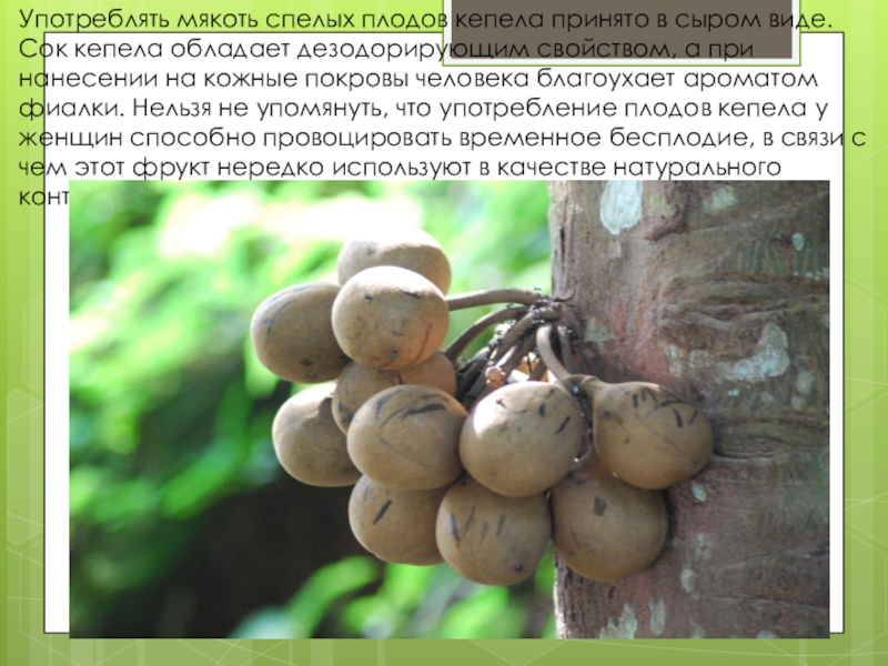 обладает дезодорирующим свойством, а при нанесении на кожные покровы человека благоухает ароматом фиалки. Нельзя не упомянуть, что употребление плодов кепела у женщин способно провоцировать временное бесплодие, в связи с чем этот фрукт нередко используют в качестве натурального контрацептива.