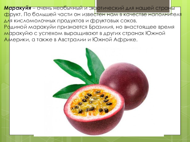 Слайд 21Маракуйя – очень необычный и экзотический для нашей страны фрукт. По