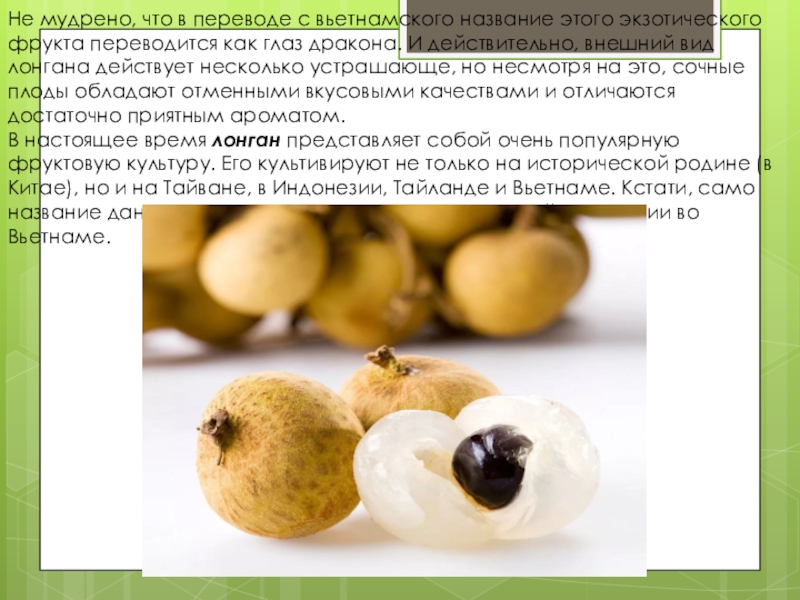 фрукта переводится как глаз дракона. И действительно, внешний вид лонгана действует несколько устрашающе, но несмотря на это, сочные плоды обладают отменными вкусовыми качествами и отличаются достаточно приятным ароматом.
