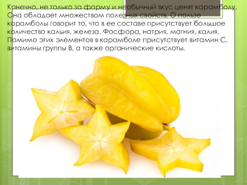 Слайд 16Конечно, не только за форму и необычный вкус ценят карамболу. Она