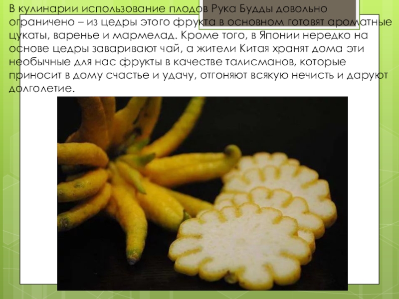 Слайд 40В кулинарии использование плодов Рука Будды довольно ограничено – из цедры
