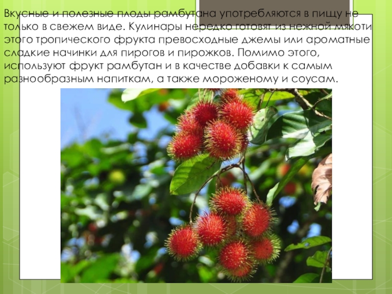 Слайд 32Вкусные и полезные плоды рамбутана употребляются в пищу не только в