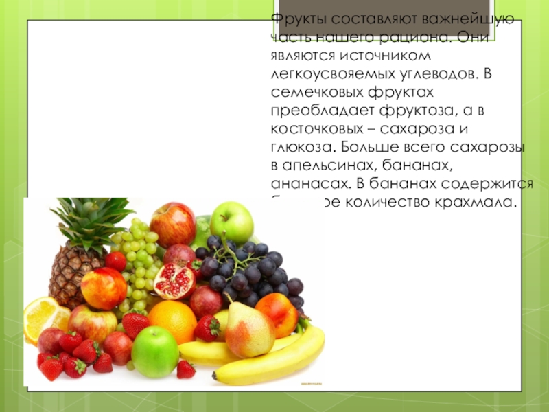 Слайд 5Фрукты составляют важнейшую часть нашего рациона. Они являются источником легкоусвояемых углеводов.