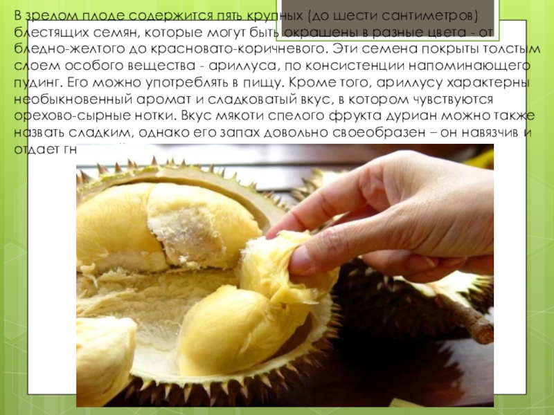 которые могут быть окрашены в разные цвета - от бледно-желтого до красновато-коричневого. Эти семена покрыты толстым слоем особого вещества - ариллуса, по консистенции напоминающего пудинг. Его можно употреблять в пищу. Кроме того, ариллусу характерны необыкновенный аромат и сладковатый вкус, в котором чувствуются орехово-сырные нотки. Вкус мякоти спелого фрукта дуриан можно также назвать сладким, однако его запах довольно своеобразен – он навязчив и отдает гнильцой.