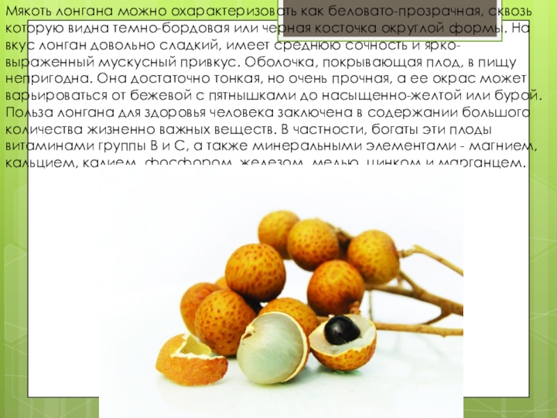 Слайд 26Мякоть лонгана можно охарактеризовать как беловато-прозрачная, сквозь которую видна темно-бордовая или