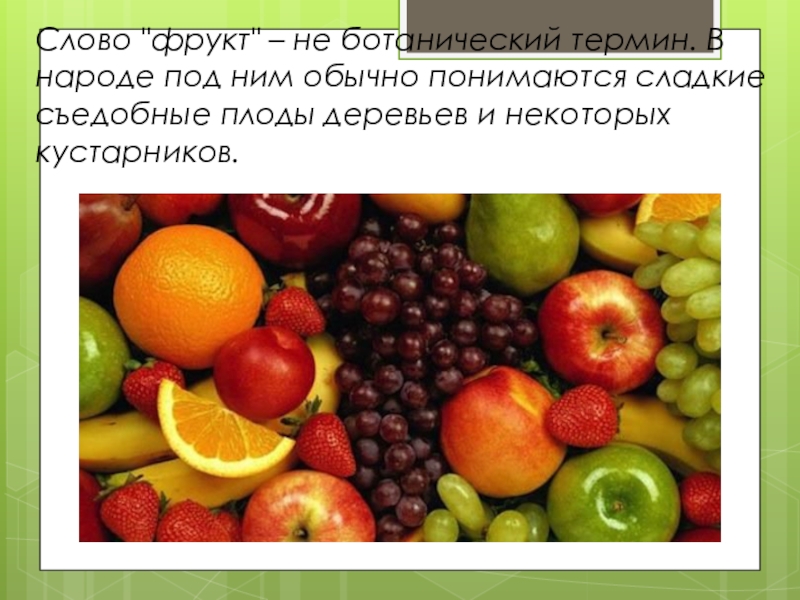 Слайд 2Слово "фрукт" – не ботанический термин. В народе под ним обычно