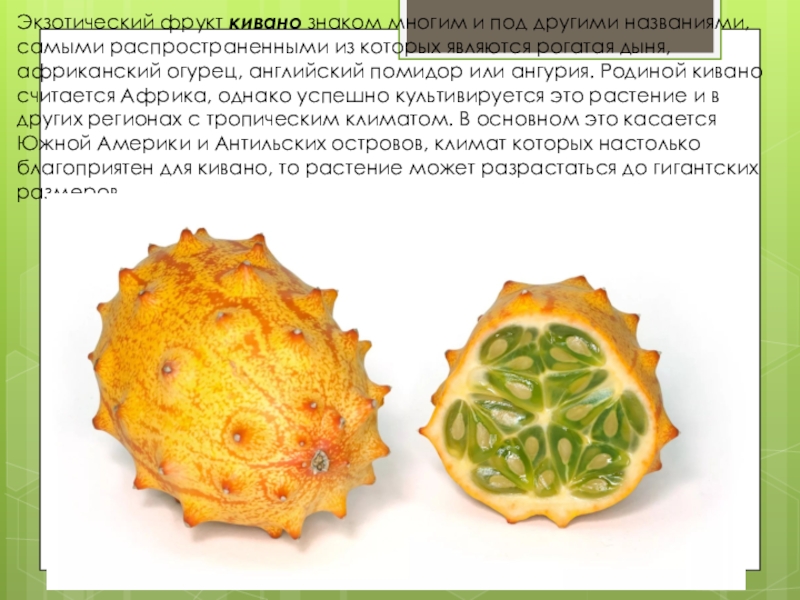 Слайд 29Экзотический фрукт кивано знаком многим и под другими названиями, самыми распространенными
