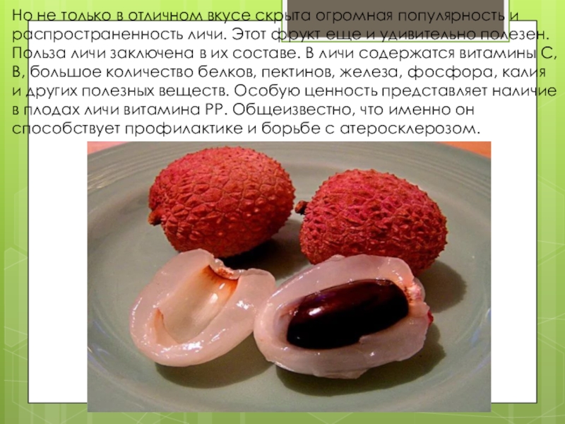 личи. Этот фрукт еще и удивительно полезен. Польза личи заключена в их составе. В личи содержатся витамины С, В, большое количество белков, пектинов, железа, фосфора, калия и других полезных веществ. Особую ценность представляет наличие в плодах личи витамина РР. Общеизвестно, что именно он способствует профилактике и борьбе с атеросклерозом.