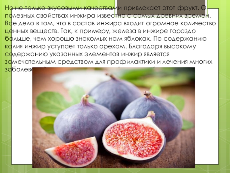 инжира известно с самых древних времен. Все дело в том, что в состав инжира входит огромное количество ценных веществ. Так, к примеру, железа в инжире гораздо больше, чем хорошо знакомых нам яблоках. По содержанию калия инжир уступает только орехам. Благодаря высокому содержанию указанных элементов инжир является замечательным средством для профилактики и лечения многих заболеваний сердечно-сосудистой и нервной систем.