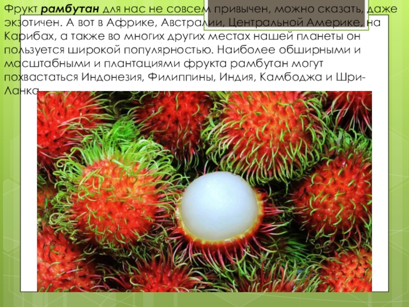 Слайд 31Фрукт рамбутан для нас не совсем привычен, можно сказать, даже экзотичен.