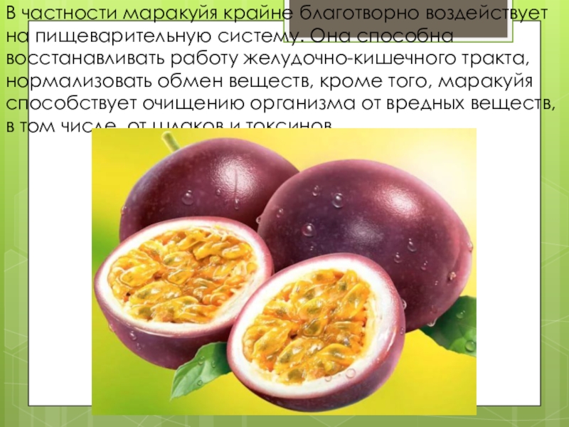 Слайд 22В частности маракуйя крайне благотворно воздействует на пищеварительную систему. Она способна