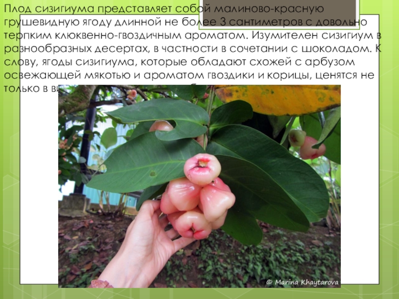 сантиметров с довольно терпким клюквенно-гвоздичным ароматом. Изумителен сизигиум в разнообразных десертах, в частности в сочетании с шоколадом. К слову, ягоды сизигиума, которые обладают схожей с арбузом освежающей мякотью и ароматом гвоздики и корицы, ценятся не только в виде свежих или переработанных плодов.