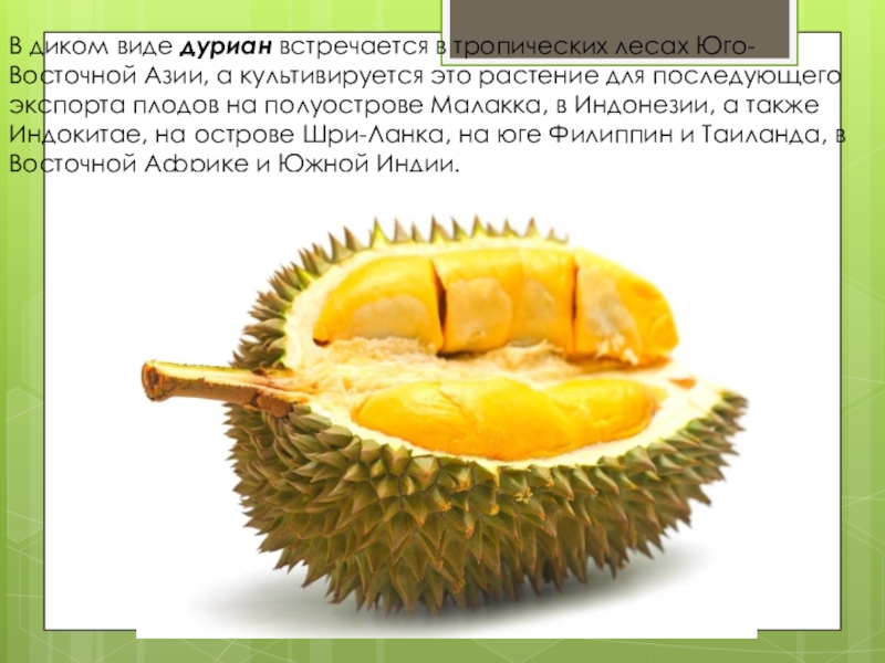 В диком виде дуриан встречается в тропических лесах Юго-Восточной Азии,
