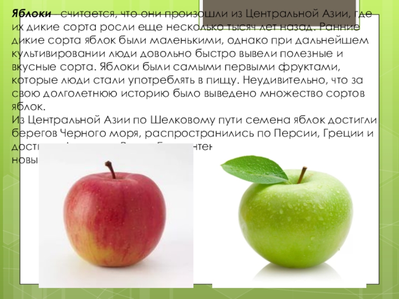 Слайд 7Яблоки - считается, что они произошли из Центральной Азии, где их