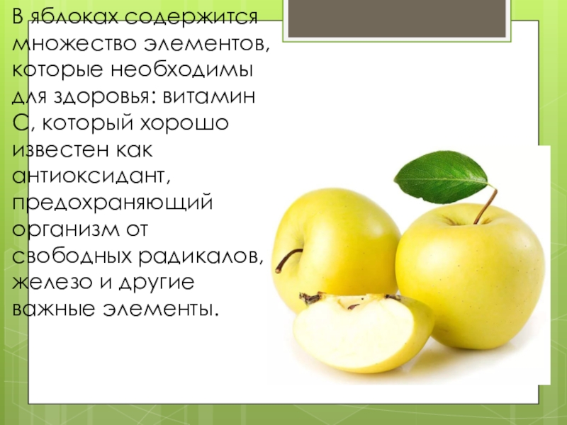 Слайд 8В яблоках содержится множество элементов, которые необходимы для здоровья: витамин С,