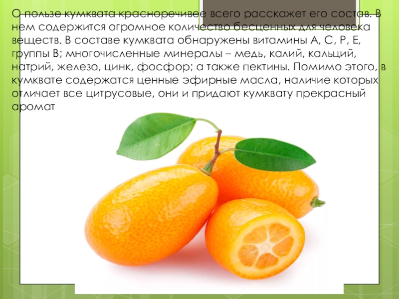 Слайд 18О пользе кумквата красноречивее всего расскажет его состав. В нем содержится
