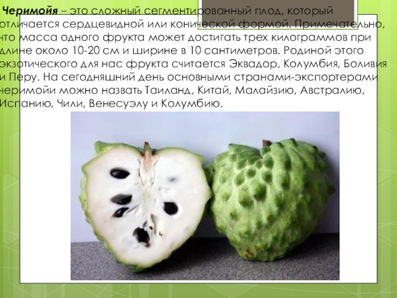 конической формой. Примечательно, что масса одного фрукта может достигать трех килограммов при длине около 10-20 см и ширине в 10 сантиметров. Родиной этого экзотического для нас фрукта считается Эквадор, Колумбия, Боливия и Перу. На сегодняшний день основными странами-экспортерами черимойи можно назвать Таиланд, Китай, Малайзию, Австралию, Испанию, Чили, Венесуэлу и Колумбию.