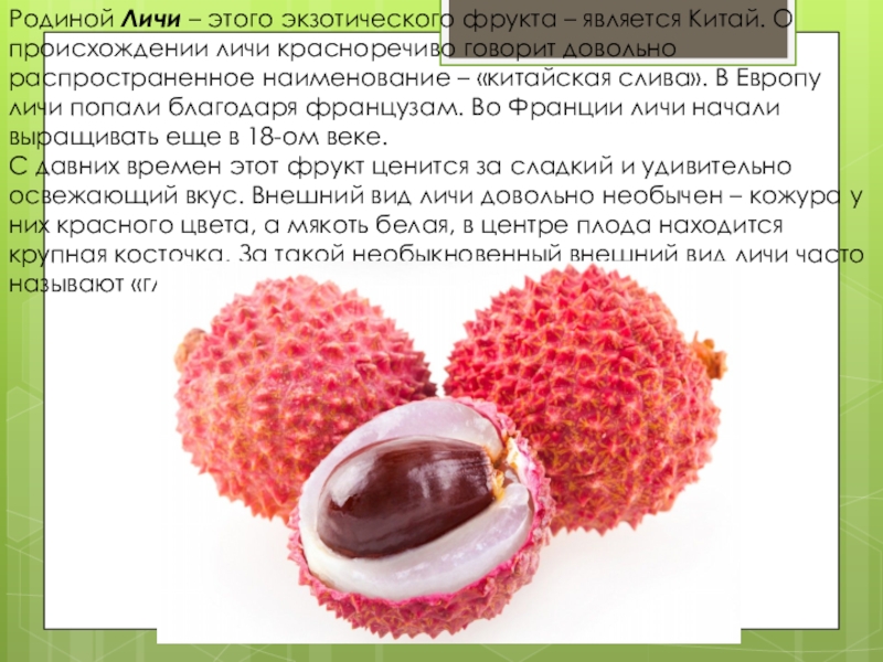 Слайд 19Родиной Личи – этого экзотического фрукта – является Китай. О происхождении