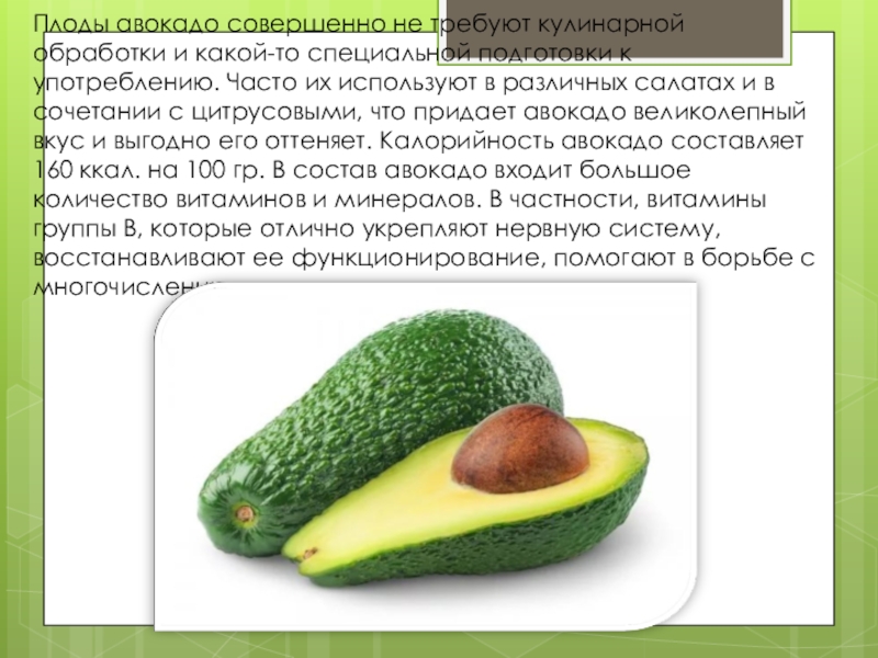 к употреблению. Часто их используют в различных салатах и в сочетании с цитрусовыми, что придает авокадо великолепный вкус и выгодно его оттеняет. Калорийность авокадо составляет 160 ккал. на 100 гр. В состав авокадо входит большое количество витаминов и минералов. В частности, витамины группы В, которые отлично укрепляют нервную систему, восстанавливают ее функционирование, помогают в борьбе с многочисленными стрессами.
