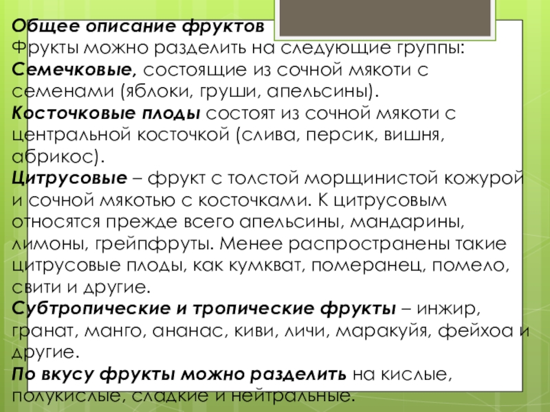 По вкусу фрукты можно разделить на кислые, полукислые, сладкие и нейтральные.