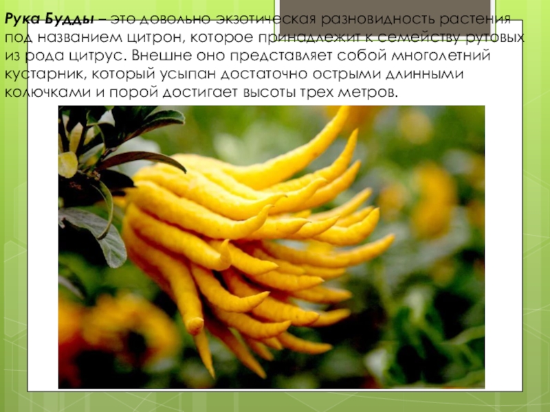 Слайд 39Рука Будды – это довольно экзотическая разновидность растения под названием цитрон,