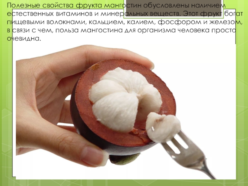 Слайд 24Полезные свойства фрукта мангостин обусловлены наличием естественных витаминов и минеральных веществ.