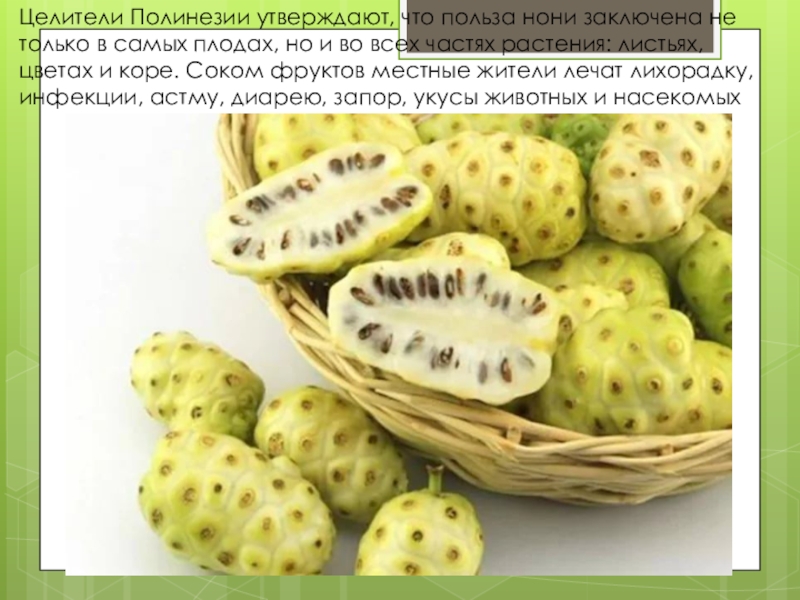 Слайд 28Целители Полинезии утверждают, что польза нони заключена не только в самых