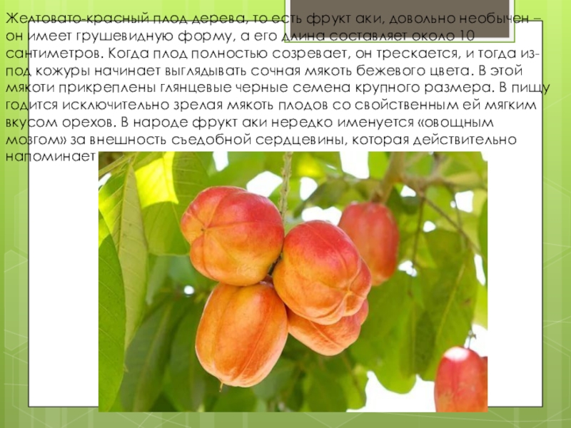 Слайд 34Желтовато-красный плод дерева, то есть фрукт аки, довольно необычен – он