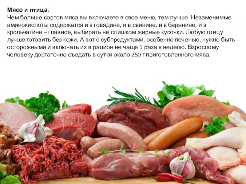 тем лучше. Незаменимые аминокислоты содержатся и в говядине, и в свинине, и в баранине, и в крольчатине – главное, выбирать не слишком жирные кусочки. Любую птицу лучше готовить без кожи. А вот с субпродуктами, особенно печенью, нужно быть осторожными и включать их в рацион не чаще 1 раза в неделю. Взрослому человеку достаточно съедать в сутки около 250 г приготовленного мяса.