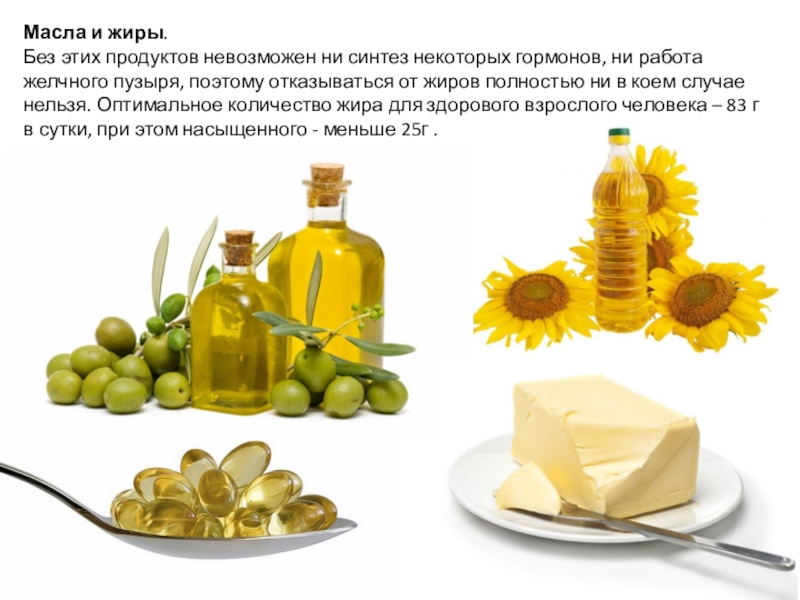 работа желчного пузыря, поэтому отказываться от жиров полностью ни в коем случае нельзя. Оптимальное количество жира для здорового взрослого человека – 83 г в сутки, при этом насыщенного - меньше 25г .