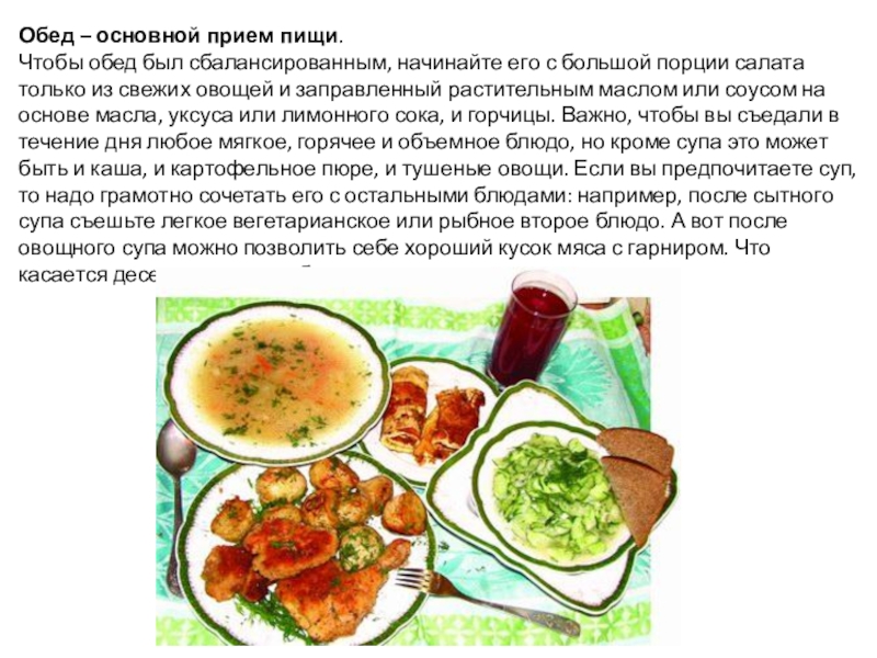 большой порции салата только из свежих овощей и заправленный растительным маслом или соусом на основе масла, уксуса или лимонного сока, и горчицы. Важно, чтобы вы съедали в течение дня любое мягкое, горячее и объемное блюдо, но кроме супа это может быть и каша, и картофельное пюре, и тушеные овощи. Если вы предпочитаете суп, то надо грамотно сочетать его с остальными блюдами: например, после сытного супа съешьте легкое вегетарианское или рыбное второе блюдо. А вот после овощного супа можно позволить себе хороший кусок мяса с гарниром. Что касается десерта, то он необязателен.