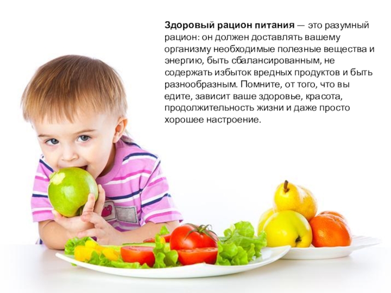 Слайд 15Здоровый рацион питания — это разумный рацион: он должен доставлять вашему