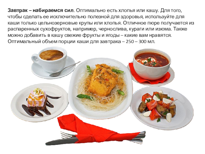 Слайд 5Завтрак – набираемся сил. Оптимально есть хлопья или кашу. Для того,