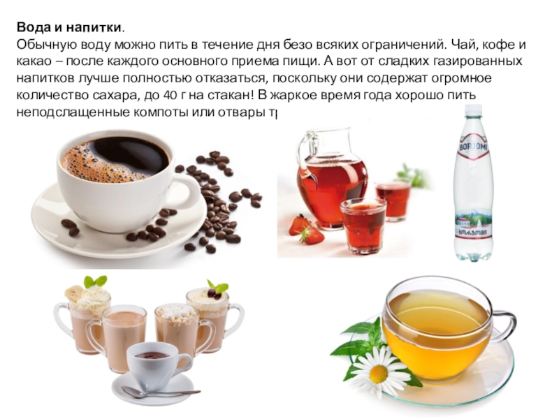 ограничений. Чай, кофе и какао – после каждого основного приема пищи. А вот от сладких газированных напитков лучше полностью отказаться, поскольку они содержат огромное количество сахара, до 40 г на стакан! В жаркое время года хорошо пить неподслащенные компоты или отвары трав – мяты, мелиссы, лимонника.