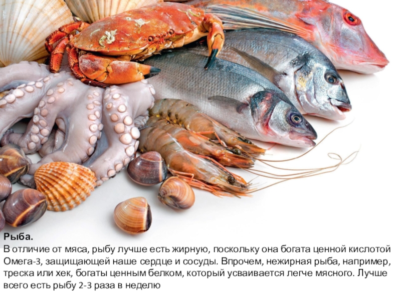 ценной кислотой Омега-3, защищающей наше сердце и сосуды. Впрочем, нежирная рыба, например, треска или хек, богаты ценным белком, который усваивается легче мясного. Лучше всего есть рыбу 2-3 раза в неделю
