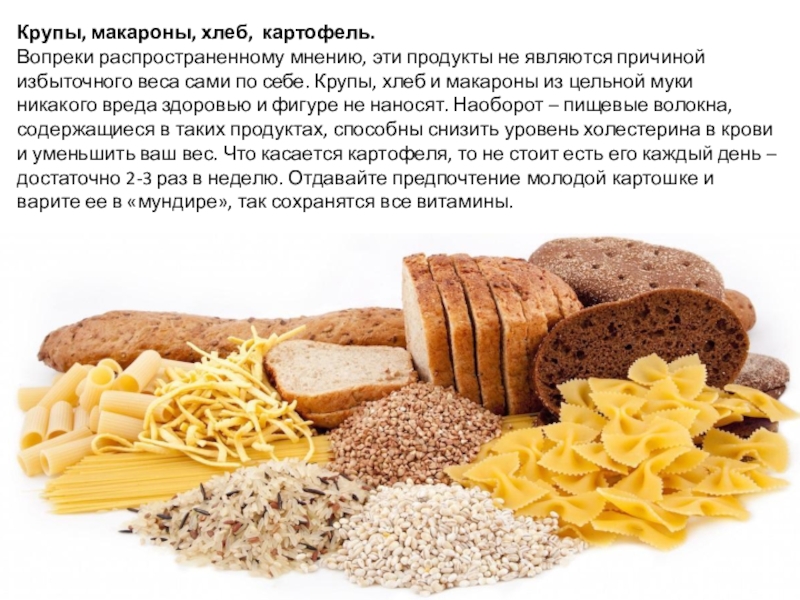 избыточного веса сами по себе. Крупы, хлеб и макароны из цельной муки никакого вреда здоровью и фигуре не наносят. Наоборот – пищевые волокна, содержащиеся в таких продуктах, способны снизить уровень холестерина в крови и уменьшить ваш вес. Что касается картофеля, то не стоит есть его каждый день – достаточно 2-3 раз в неделю. Отдавайте предпочтение молодой картошке и варите ее в «мундире», так сохранятся все витамины.