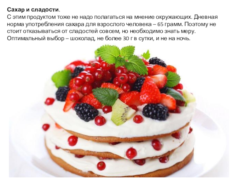 окружающих. Дневная норма употребления сахара для взрослого человека – 65 грамм. Поэтому не стоит отказываться от сладостей совсем, но необходимо знать меру. Оптимальный выбор – шоколад, не более 30 г в сутки, и не на ночь.