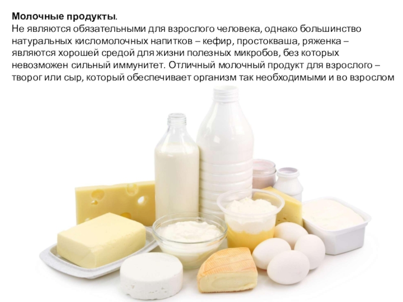 напитков – кефир, простокваша, ряженка – являются хорошей средой для жизни полезных микробов, без которых невозможен сильный иммунитет. Отличный молочный продукт для взрослого – творог или сыр, который обеспечивает организм так необходимыми и во взрослом возрасте кальцием и белком.