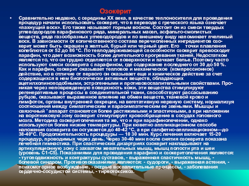 Сравнительно недавно, с середины XX века, в качестве теплоносителя для проведения процедур начали использовать озокерит, что в переводе с греческого языка означает «пахнущий воск». Его также называют горным воском. Состоит он из смеси твердых углеводородов парафинового ряда, минеральных масел, асфальто-смолистых веществ, ряда газообразных углеводородов и по внешнему виду напоминает пчелиный воск. В зависимости от количественного состава перечисленных ингредиентов озо-керит может быть окрашен в желтый, бурый или черный цвет. Его точки плавления колеблются от 52 до 86 °С. По теплоудерживающей способности озокерит превосходит парафин, что дает возможность более длительного прогревания тканей. Недостатком является то, что он трудно отделяется от поверхности и пачкает белье. Поэтому часто используют смеси озокерита с парафином, где содержание последнего от 30 до 50 %. Как и парафин, озокерит оказывает тепловое и механическое (компрессионное) действие, но в отличие от первого он оказывает еще и химическое действие за счет содержащихся в нем биологически активных веществ, обладающих ацетилхолиноподобными, эстрогенными и противовоспалительными свойствами. Про-никая через неповрежденную поверхность кожи, эти вещества стимулируют регенеративные процессы в соединительной ткани, способствуют рассасыванию рубцов, оказывают выраженное влияние на обмен веществ, тканевой крово и лимфоток, органы внутренней секреции, на вегетативную нервную систему, нормализуя соотношения между симпатическим и парасимпатическим ее звеньями. Мышцы и связочный ' аппарат становятся более растяжимыми и эластичными, а при наложении на воротниковую зону озокерит стимулирует кровообращение в сосудах головного мозга. Методика озокеритолечения та же, что и при парафинолечении, однако используются более низкие температуры. При кюветно аппликационном способе наложения озокерита он остужается до 40-42 °С, а при салфетно-аппликационном—до 38-40°С. Продолжительность процедуры — 10 30 мин. Курс лечения включает 15-20 процедур, проводимых через день. Через 30-40 мин после снятия озокерита показана лечебная гимнастика. При спастических дизартриях озокерит накладывают на артикуляционную зону с захватом жевательных мышц, мышц полости рта и шеи (уровень С1-С5). Показаниями для проведения парафино и озокеритолечения являются: - тугоподвижность и контрактуры суставов, - выраженная спастичность мышц, - болевой синдром. Противопоказаниями являются: - судороги, - выраженная астения, - психомоторное возбуждение, - острые воспалительные про-цессы, - заболевания сердечно-сосудистой системы, - тиреотоксикоз.