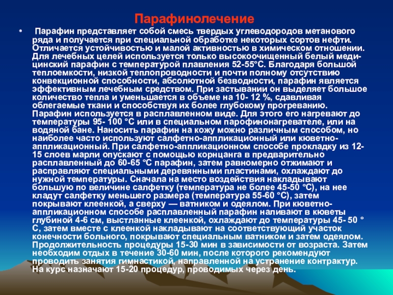 Парафин представляет собой смесь твердых углеводородов метанового ряда и получается при специальной обработке некоторых сортов нефти. Отличается устойчивостью и малой активностью в химическом отношении. Для лечебных целей используется только высокоочищенный белый меди-цинский парафин с температурой плавления 52-55°С. Благодаря большой теплоемкости, низкой теплопроводности и почти полному отсутствию конвекционной способности, абсолютной безводности, парафин является эффективным лечебным средством. При застывании он выделяет большое количество тепла и уменьшается в объеме на 10- 12 %, сдавливая облегаемые ткани и способствуя их более глубокому прогреванию. Парафин используется в расплавленном виде. Для этого его нагревают до температуры 95- 100 °С или в специальном парофинонагревателе, или на водяной бане. Наносить парафин на кожу можно различным способом, но наиболее часто используют салфетно-аппликационный или кюветно-аппликационный. При салфетно-аппликационном способе прокладку из 12- 15 слоев марли опускают с помощью корнцанга в предварительно расплавленный до 60-65 °С парафин, затем равномерно отжимают и расправляют специальными деревянными пластинами, охлаждают до нужной температуры. Сначала на место воздействия накладывают большую по величине салфетку (температура не более 45-50 °С), на нее кладут салфетку меньшего размера (температура 55-60 °С), затем покрывают клеенкой, а сверху — ватником и одеялом. При кюветно-аппликационном способе расплавленный парафин наливают в кюветы глубиной 4-6 см, выстланные клеенкой, охлаждают до температуры 45- 50 °С, затем вместе с клеенкой накладывают на соответствующий участок конечности больного, покрывают специальным ватником и затем одеялом. Продолжительность процедуры 15-30 мин в зависимости от возраста. Затем необходим отдых в течение 30-60 мин, после которого рекомендуют проводить занятия гимнастикой, направленной на устранение контрактур. На курс назначают 15-20 процедур, проводимых через день.