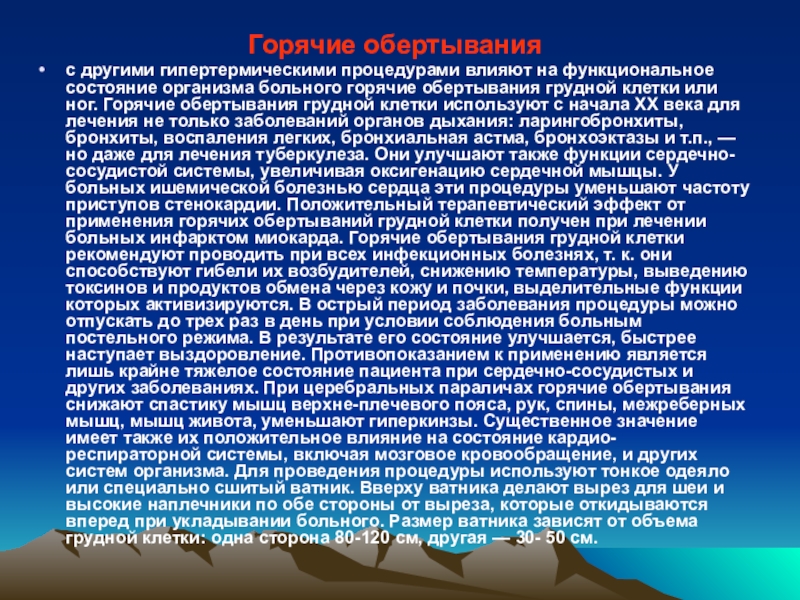 с другими гипертермическими процедурами влияют на функциональное состояние организма больного горячие обертывания грудной клетки или ног. Горячие обертывания грудной клетки используют с начала XX века для лечения не только заболеваний органов дыхания: ларингобронхиты, бронхиты, воспаления легких, бронхиальная астма, бронхоэктазы и т.п., — но даже для лечения туберкулеза. Они улучшают также функции сердечно-сосудистой системы, увеличивая оксигенацию сердечной мышцы. У больных ишемической болезнью сердца эти процедуры уменьшают частоту приступов стенокардии. Положительный терапевтический эффект от применения горячих обертываний грудной клетки получен при лечении больных инфарктом миокарда. Горячие обертывания грудной клетки рекомендуют проводить при всех инфекционных болезнях, т. к. они способствуют гибели их возбудителей, снижению температуры, выведению токсинов и продуктов обмена через кожу и почки, выделительные функции которых активизируются. В острый период заболевания процедуры можно отпускать до трех раз в день при условии соблюдения больным постельного режима. В результате его состояние улучшается, быстрее наступает выздоровление. Противопоказанием к применению является лишь крайне тяжелое состояние пациента при сердечно-сосудистых и других заболеваниях. При церебральных параличах горячие обертывания снижают спастику мышц верхне-плечевого пояса, рук, спины, межреберных мышц, мышц живота, уменьшают гиперкинзы. Существенное значение имеет также их положительное влияние на состояние кардио- респираторной системы, включая мозговое кровообращение, и других систем организма. Для проведения процедуры используют тонкое одеяло или специально сшитый ватник. Вверху ватника делают вырез для шеи и высокие наплечники по обе стороны от выреза, которые откидываются вперед при укладывании больного. Размер ватника зависят от объема грудной клетки: одна сторона 80-120 см, другая — 30- 50 см.
