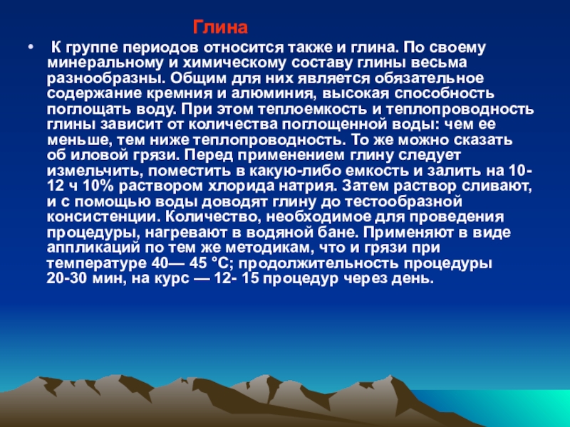К группе периодов относится также и глина. По своему минеральному и химическому составу глины весьма разнообразны. Общим для них является обязательное содержание кремния и алюминия, высокая способность поглощать воду. При этом теплоемкость и теплопроводность глины зависит от количества поглощенной воды: чем ее меньше, тем ниже теплопроводность. То же можно сказать об иловой грязи. Перед применением глину следует измельчить, поместить в какую-либо емкость и залить на 10- 12 ч 10% раствором хлорида натрия. Затем раствор сливают, и с помощью воды доводят глину до тестообразной консистенции. Количество, необходимое для проведения процедуры, нагревают в водяной бане. Применяют в виде аппликаций по тем же методикам, что и грязи при температуре 40— 45 °С; продолжительность процедуры 20-30 мин, на курс — 12- 15 процедур через день.