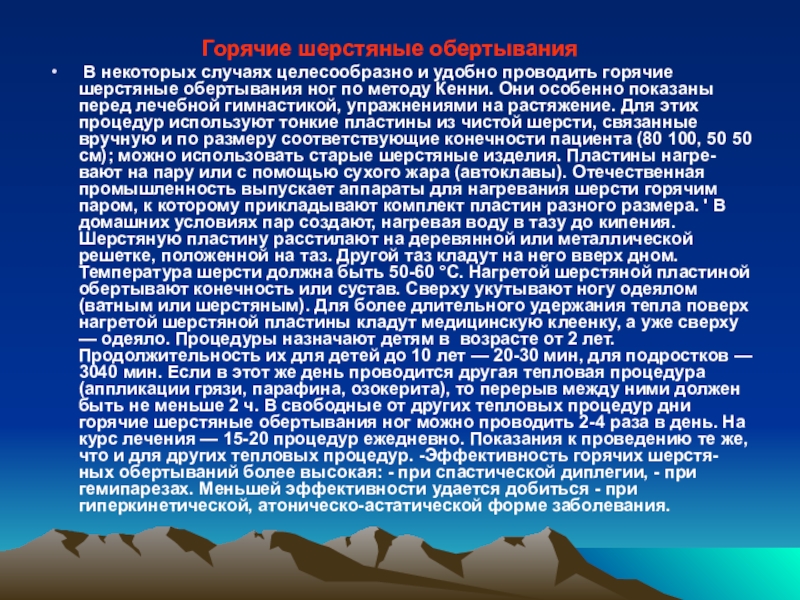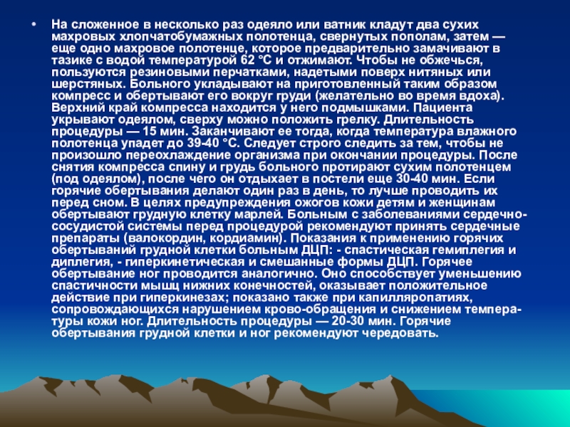 махровых хлопчатобумажных полотенца, свернутых пополам, затем — еще одно махровое полотенце, которое предварительно замачивают в тазике с водой температурой 62 °С и отжимают. Чтобы не обжечься, пользуются резиновыми перчатками, надетыми поверх нитяных или шерстяных. Больного укладывают на приготовленный таким образом компресс и обертывают его вокруг груди (желательно во время вдоха). Верхний край компресса находится у него подмышками. Пациента укрывают одеялом, сверху можно положить грелку. Длительность процедуры — 15 мин. Заканчивают ее тогда, когда температура влажного полотенца упадет до 39-40 °С. Следует строго следить за тем, чтобы не произошло переохлаждение организма при окончании процедуры. После снятия компресса спину и грудь больного протирают сухим полотенцем (под одеялом), после чего он отдыхает в постели еще 30-40 мин. Если горячие обертывания делают один раз в день, то лучше проводить их перед сном. В целях предупреждения ожогов кожи детям и женщинам обертывают грудную клетку марлей. Больным с заболеваниями сердечно-сосудистой системы перед процедурой рекомендуют принять сердечные препараты (валокордин, кордиамин). Показания к применению горячих обертываний грудной клетки больным ДЦП: - спастическая гемиплегия и диплегия, - гиперкинетическая и смешанные формы ДЦП. Горячее обертывание ног проводится аналогично. Оно способствует уменьшению спастичности мышц нижних конечностей, оказывает положительное действие при гиперкинезах; показано также при капилляропатиях, сопровождающихся нарушением крово-обращения и снижением темпера-туры кожи ног. Длительность процедуры — 20-30 мин. Горячие обертывания грудной клетки и ног рекомендуют чередовать.