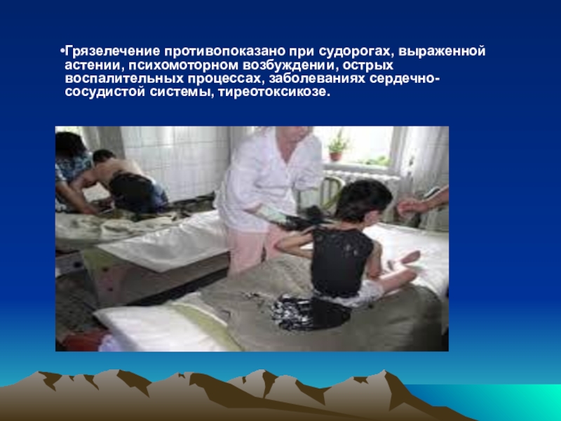 Слайд 8Грязелечение противопоказано при судорогах, выраженной астении, психомоторном возбуждении, острых воспалительных процессах,