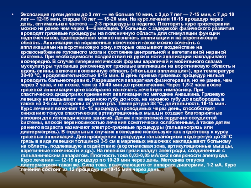 с 3 до 7 лет — 7-15 мин, с 7 до 10 лет — 12-15 мин, старше 10 лет — 15-20 мин. На курс лечения 10-15 процедур через день, оптимальная частота — 2-3 процедуры в неделю. Повторять курс грязетерапии можно не ранее чем через 4—6 месяцев. У больных с задержкой физического развития проводят грязевые процедуры на поясничную область для стимуляции функции надпочечников, одновременно можно назначать аппликации и на воротниковую область. Аппликации на пораженные конечности также можно сочетать с аппликациями на воротниковую зону, которые оказывают воздействие на кровоснабжение головного мозга и состояние центральной и вегетативной нервной системы. При необходимости воздействия на руки и ноги аппликации накладывают поочередно. В случае гиперкинетической формы параличей и мобильного спазма мускулатуры туловища рекомендуют грязевые аппликации на воротниковую область и вдоль спины, включая поясничную область («большая аппликация»), при температуре 38-40 °С, продолжительностью 8-15 мин. В день приема грязевых процедур нельзя проводить бальнеотерапию. Разрешается аппаратная физиотерапия, но не ранее, чем через 2 часа, и не позже, чем за 30-40 мин до грязелечения. Через 1,5-2 часа после грязевой аппликации целесообразно назначать лечебную гимнастику. При спастических дизартриях применяют аппликации по методике Анашкина. Грязевую лепешку накладывают на верхнюю губу до носа, на нижнюю губу до подбородка, а также на 3-5 см в стороны от углов рта. Температура 38 °С, длительность 10-15 мин. Курс лечения включает 10- 15 процедур, проводимых через день, способствует снижению тонуса спастических артикуляционных мышц и создает благоприятные условия для логопедических занятий. Детям с патологией сердечно-сосудистой системы, плохой переносимостью лечения соматически ослабленным, а также детям раннего возраста назначают электро-грязевые процедуры (гальваногрязь или диатермогрязь). В отдельных случаях последние используют как подготовку к курсу грязевых аппликаций. Для проведения процедуры гальваногрязи подогретую до 38°С грязь в виде лепешки толщиной 3-5 см в марлевых мешочках накладывают больному на область, подлежащую воздействию (воротниковая зона, артикуляционные мышцы, паретичные конечности и др.). На лепешки грязи кладут электроды, соединенные с гальваническим аппаратом. Плотность тока 0,03-0,05 мА/см2 поверхности электрода. Курс лечения — 12-15 процедур по 10-20 мин через день. Методика отпуска диатермогрязи такая же. Сила тока, по-ступающего от аппарата диатермии, 1-2 мА. Курс лечения состоит из 12 процедур по 10-15 мин через день.