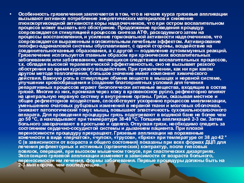 вызывают активное потребление энергетических материалов и снижение глюкокортикоидной активности коры надпочечников, что при остром воспалительном процессе может вызвать его обострение. Продолжение проведения процедур сопровождается стимуляцией процессов синтеза АТФ, расходуемого затем на процессы восстановления, и усиление гормональной активности надпочечников, что сопровождается выраженным положительным лечебным эффектом. Активирование гипофиз-адреналовой системы обуславливает, с одной стороны, воздействие на соединительнотканные образования, а с другой — подавление аутоиммунных реакций. Грязелечение используется главным образом при хронических воспалительных заболеваниях или заболеваниях, являющихся следствием воспалительных процессов, т.к. обладая высокой терапевтической эффективностью, оно не вызывает резкого обострения во время курсового воздействия. При грязелечении, как ни при каком другом методе теплолечения, большое значение имеет компонент химического действия. Важную роль в стимуляции обмена веществ в мышцах и нервной системе, улучшении кровообращения и создании благоприятных условий для течения репаративных процессов играют биологически активные вещества, входящие в состав грязей. Многие из них, проникая через кожу в кровеносное русло, рефлекторно влияют на центральную нервную систему и внутренние органы. Грязи, оказывая местное и общее рефлекторное воздействие, способствуют ускорению процессов миелинизации, уменьшению очаговых рубцовых изменений в нервной ткани и мозговых оболочках, снижают патологический тонус мышц, повышают эластичность сухожильносвязочного аппарата. Для проведения процедуры грязь подогревают в водяной бане не более чем до 50 °С, а накладывают при температуре 38-40 °С. Толщина аппликаций 2-3 см. Затем больного заворачивают в простыню и одеяло. Отпуская грязи, необходимо следить за состоянием сердечно-сосудистой системы и дыханием пациента. При плохой переносимости процедуру прекращают. Грязевые аппликации на пораженные конечности в виде «перчаток», «чулок», «трусов», «брюк» при температуре от 38 до 42 °С (в зависимости от возраста и общего состояния) показаны при всех формах ДЦП для лечения рефлекторных и истинных (органических) контрактур, после гипсовых повязок, операций, при высоком мышечном тонусе, при спастических дизартриях. Экспозицию грязевой аппликации изменяют в зависимости от возраста больного, переносимости им лечения, формы заболевания. Первые процедуры должны быть на 2-3 мин короче, чем последующие.