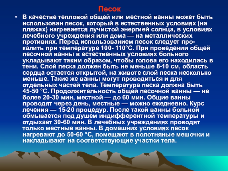 В качестве тепловой общей или местной ванны может быть использован песок, который в естественных условиях (на пляжах) нагревается лучистой энергией солнца, в условиях лечебного учреждения или дома — на металлических противнях. Перед использованием песок следует про-калить при температуре 100- 110°С. При проведении общей песочной ванны в естественных условиях больного укладывают таким образом, чтобы голова его находилась в тени. Слой песка должен быть не меньше 8-10 см, область сердца остается открытой, на животе слой песка несколько меньше. Такие же ванны могут проводиться и для отдельных частей тела. Температура песка должна быть 45-50 °С. Продолжительность общей песочной ванны — не более 20-30 мин, местной — до 60 мин. Общие ванны проводят через день, местные — можно ежедневно. Курс лечения — 15-20 процедур. После такой ванны больной обмывается под душем индифферентной температуры и отдыхает 30-60 мин. В лечебных учреждениях проводят только местные ванны. В домашних условиях песок нагревают до 50-60 °С, помещают в полотняные мешочки и накладывают на соответствующие участки тела.